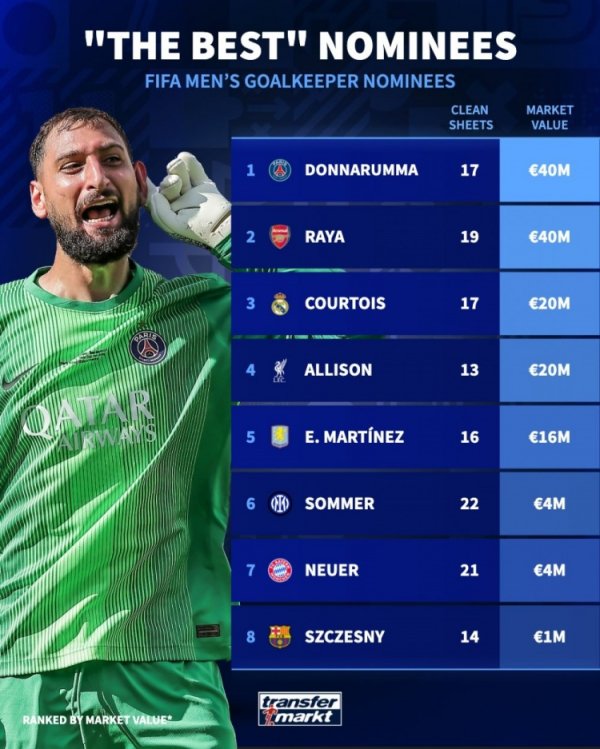 FIFA最好门将候选身价名次:多纳鲁马、拉亚4000万欧居首