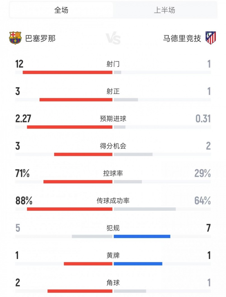 巴萨vs马竞上半场数据:射门12比1、射正3比1、控球率71%比29%