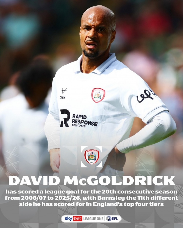 据EFL统计,从2006-2007赛季到2025-2026赛季,现年37岁的麦克高德里克连合20个赛季在联赛中获得进球,他为11支不同的英格兰前四级别球队攻入联赛进球。