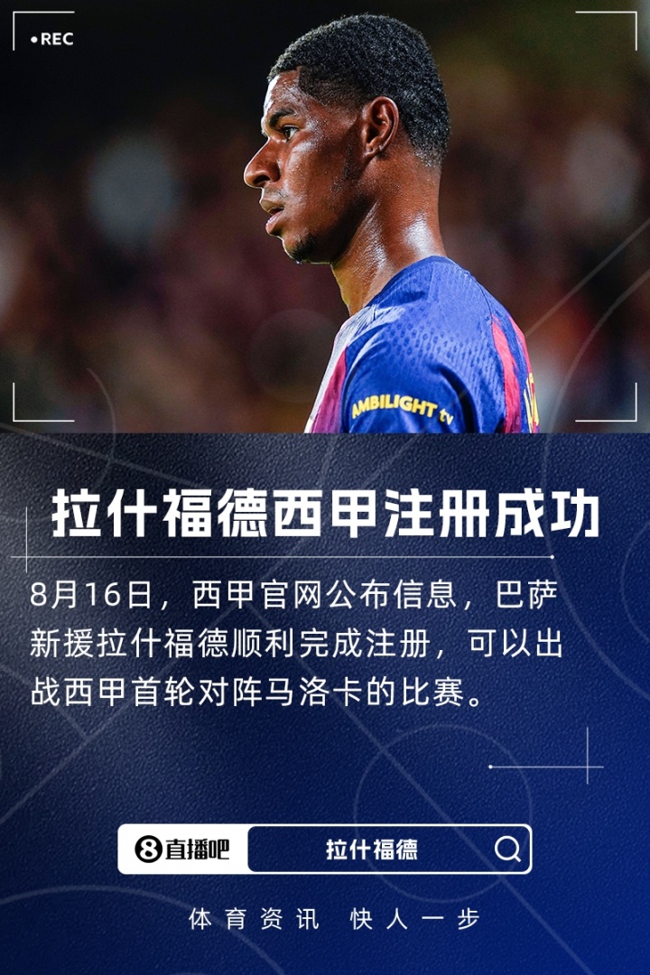 08月16日讯 据西甲官网显现,巴萨今夏新引进的时尚拉什福德依然完成注册,他将不错进入新赛季西甲首轮比赛。