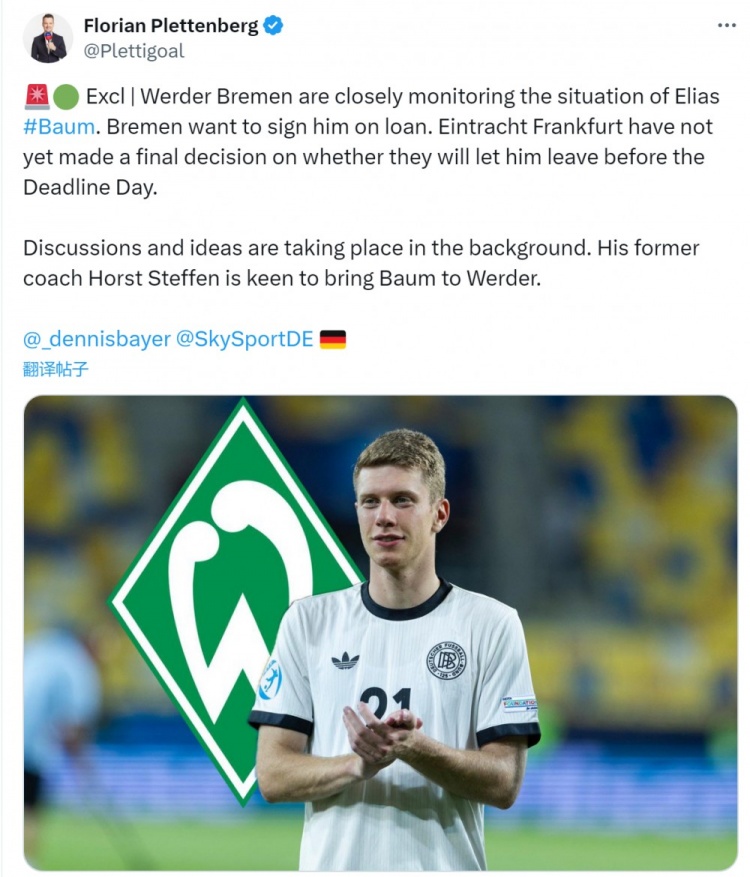 媒体指出,不莱梅正在密切温雅鲍姆的情况,但愿将其租出至阵中,法兰克福尚未作念出最终决定,关系推敲正在进行中。不莱梅主帅斯特芬上赛季曾在埃弗斯堡抓教鲍姆,他但愿签下这位小将。