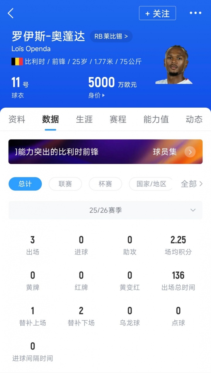 25岁的奥蓬达司职时尚,上赛季为莱比锡各项赛事45场13球7助攻,德回身价5000万欧元。
