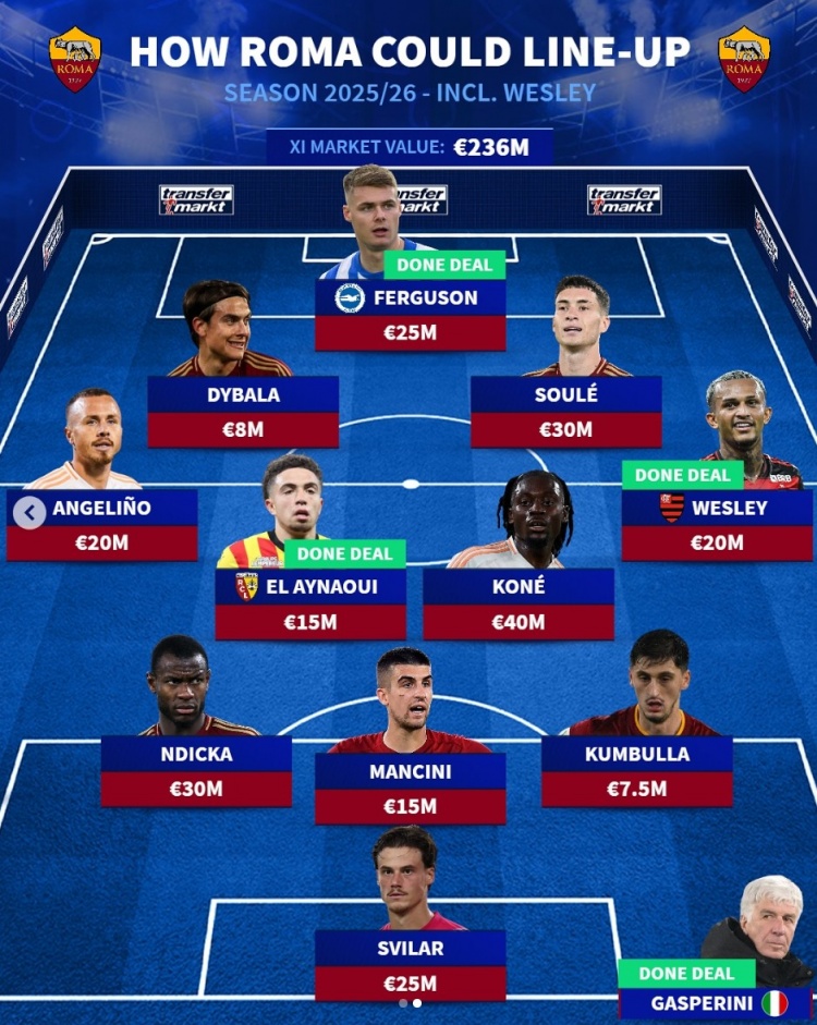 德转列罗马新赛季主力阵:迪巴拉领衔,韦斯利、埃文-弗格森在列