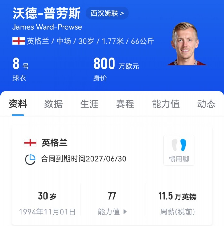 沃德-普劳斯现在的德回身价为800万欧元,他因擅长定位球而著名;现在他与西汉姆的左券将在2027年到期。