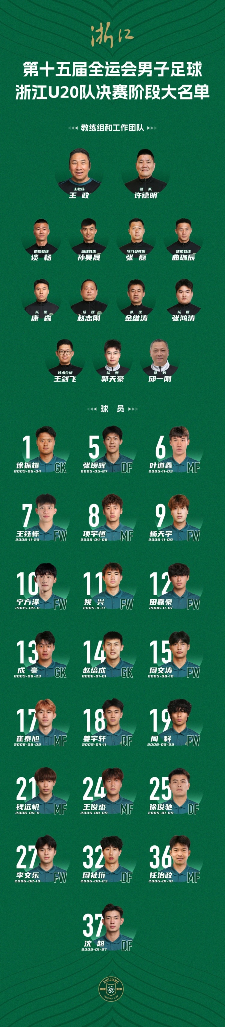 10月28日讯 第十五届全运会行将伸开男足U20决赛阶段的较量,浙江队当天公布参赛名单,其中包括了王钰栋和张瑷晖等球员。这支球队将由原浙江绿城主培植王政挂帅,绿城旧将张磊、道杨担任助理培植。