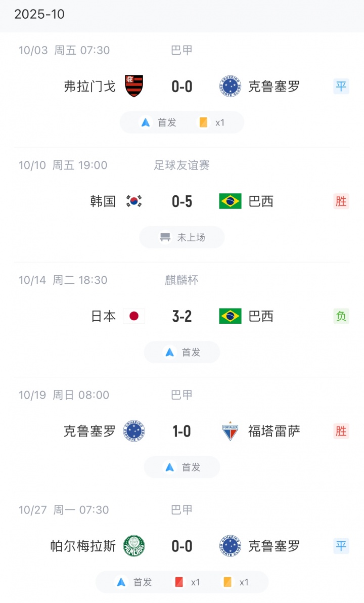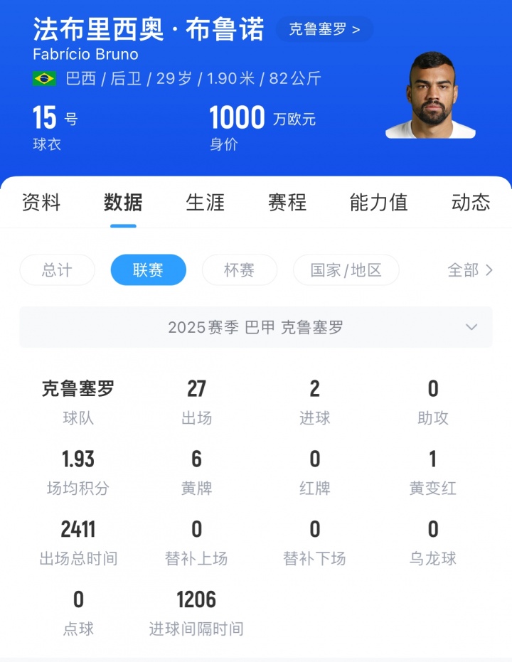 战日本狂站立!克鲁塞罗中卫布鲁诺入选巴西名单,上轮联赛刚染红