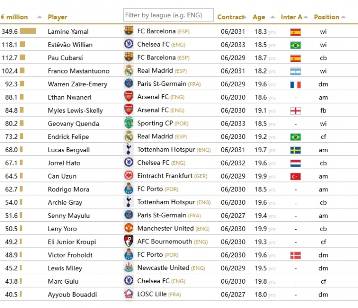 11月05日讯 本日,足球巨擘统计机构CIES统计了尚未年满20岁但预估转会费最高的球员,其中四位球员的预估转会费卓越1亿欧元(含附加要求,且为100%所有权)。亚马尔3.5亿欧,断层率先!
