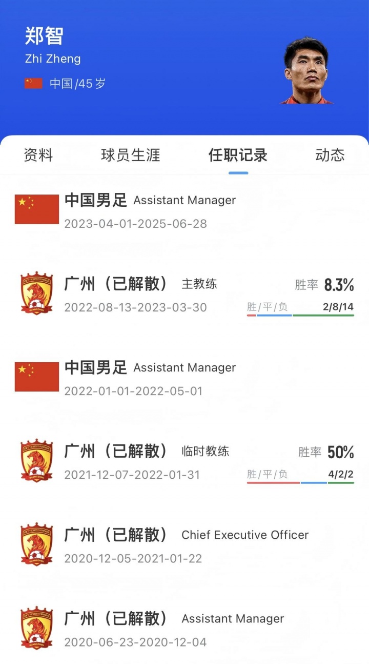 2021年12月7日,郑智出任广州队实际主造就兼球员。2022年1月,41岁的郑智出战广州队vs长春亚泰的中超比赛,这是他干事活命终末一次出场。2022年8月,郑智出任广州队主造就。 2023年2月27日,郑智出任国足助教 。跟着伊万离任,郑智也退出洋足助教团队。
