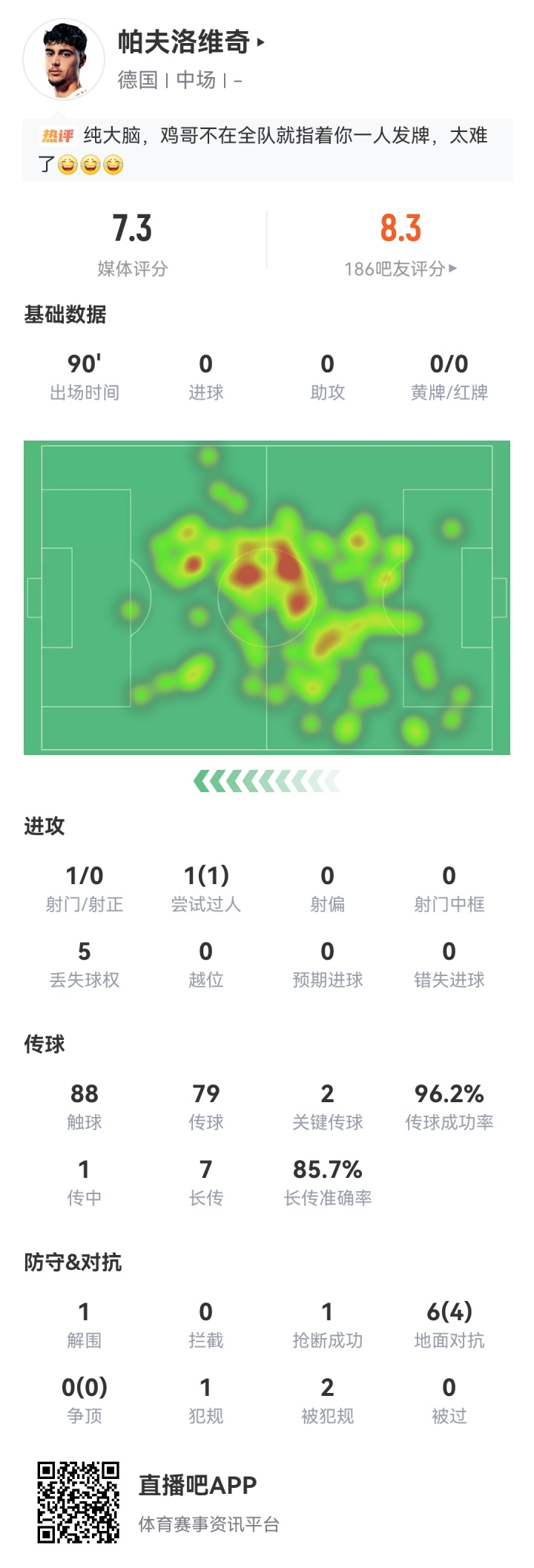 帕夫洛维奇(21岁):代表德国队首发出战,担任后腰打满全场,德国2-0卢森堡