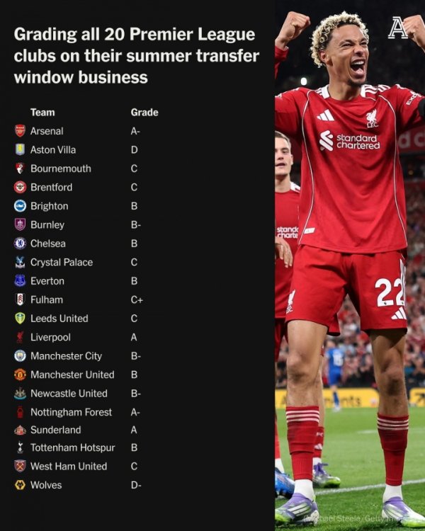 TA为英超20队夏窗评级:利物浦A,枪手A-,蓝军曼联热刺B,曼城B-