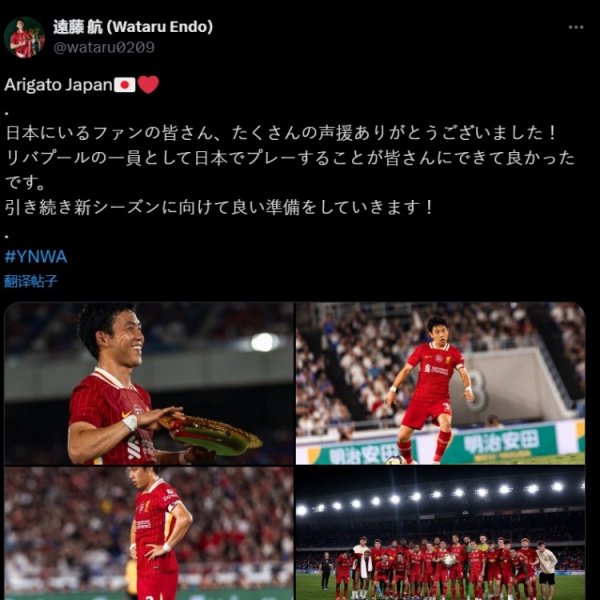 远藤航感谢日本球迷:感谢应援,很欣喜算作利物浦球员为民众踢球