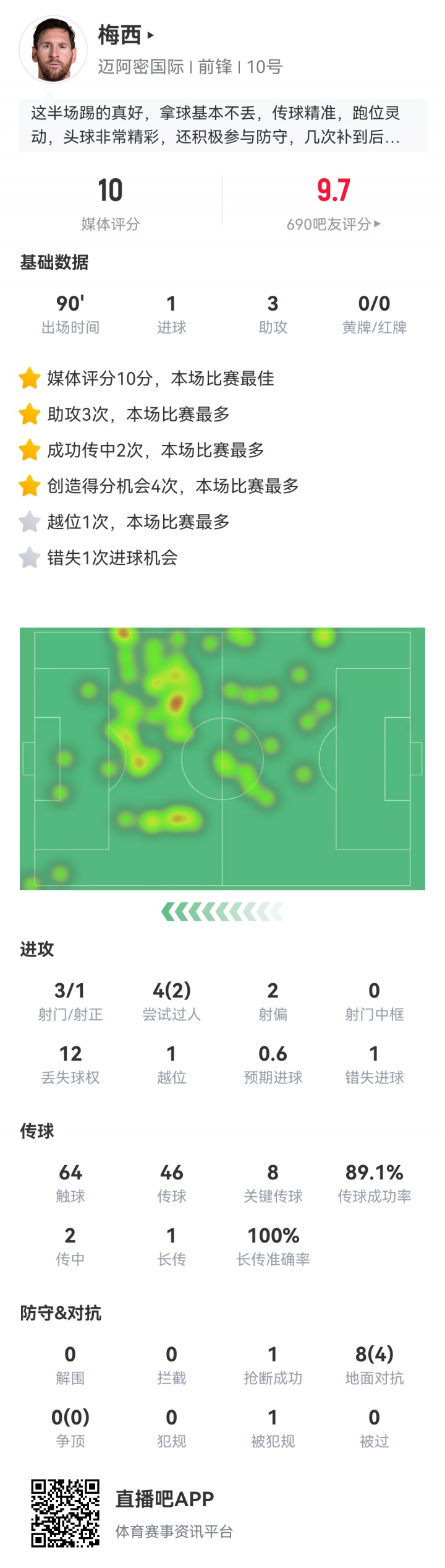 又把评分印背上!梅西本场数据:1射3传独造4球,媒体评分10分!