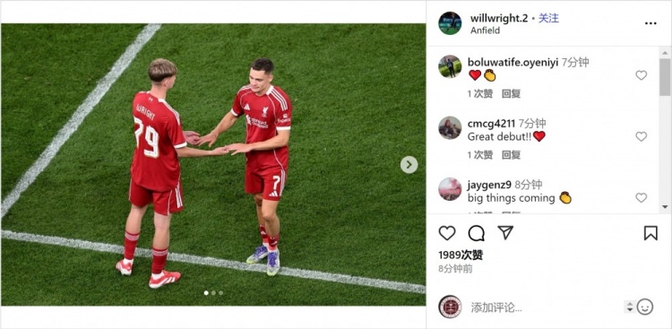 改日可期!利物浦17岁新援赖特社媒晒热身赛替补出场像片