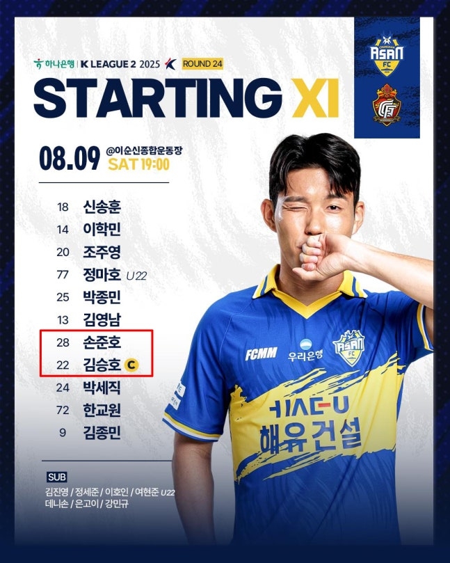 在昨日进行的K2联赛中,忠南牙山2-2主场打平庆南,孙准浩(球衣号码28号)不绝首发,但场上的队长却是22号金承浩。