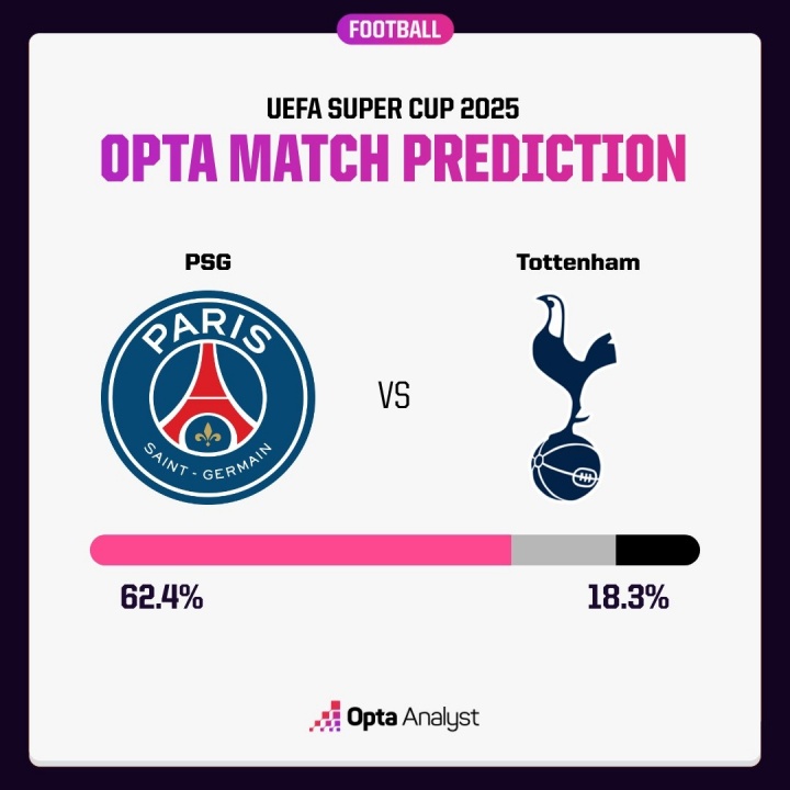 OPTA展望欧超杯生效概率:惯例本领巴黎62.4%概率生效,热刺18.3%