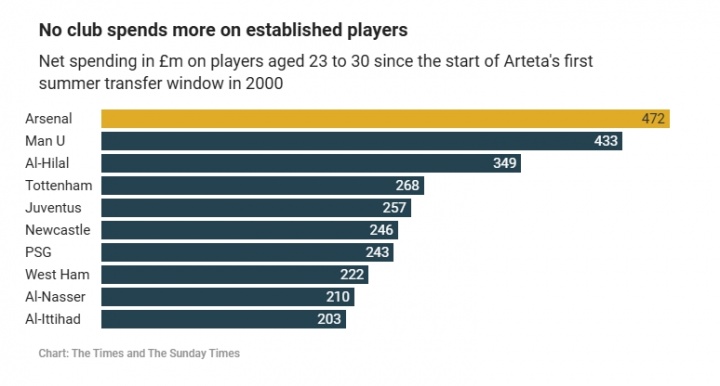 自阿尔特塔2020年夏首度执掌转会窗以来,各队练习年岁段(23-30岁)球员净开销对比↓