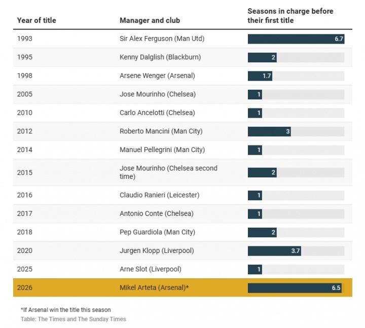 若本赛季阿尔特塔率阿森纳问鼎英超,这将成为英超时期除弗格森爵士(曼联)外,俱乐部恭候主帅首夺联赛冠军最久的案例。