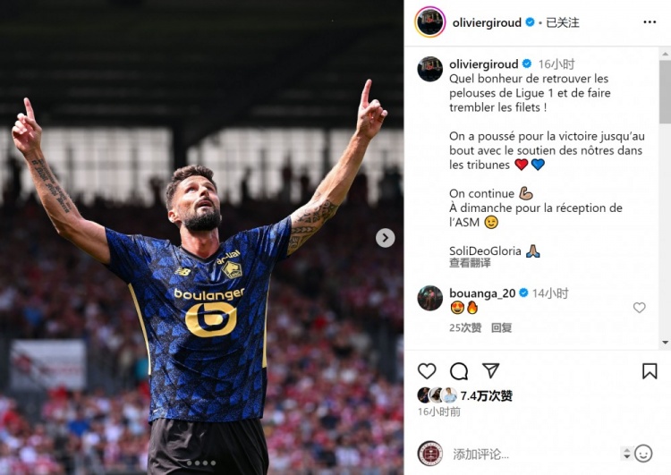 首秀破门⚽吉鲁社媒:回到法甲赛场并进球简直太得意了!