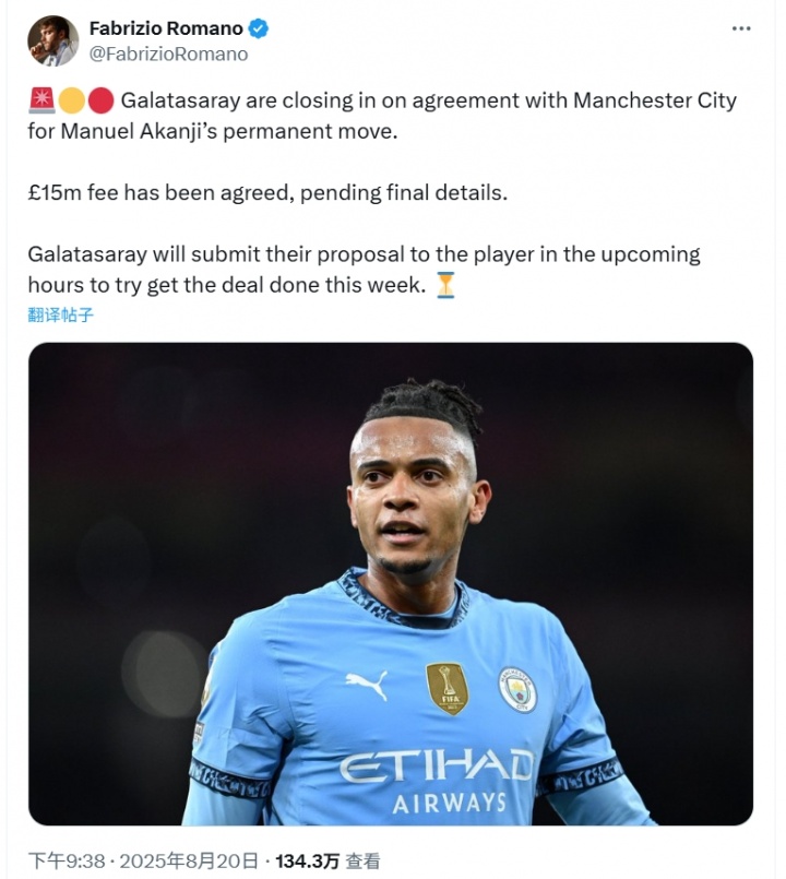 08月20日讯 罗马诺此前报谈称,加拉塔萨雷行将与曼城就阿坎吉完了公约。