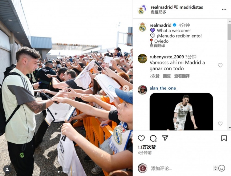 皇马社媒晒球员们抵达奥维耶多像片,受到球迷激烈迎接