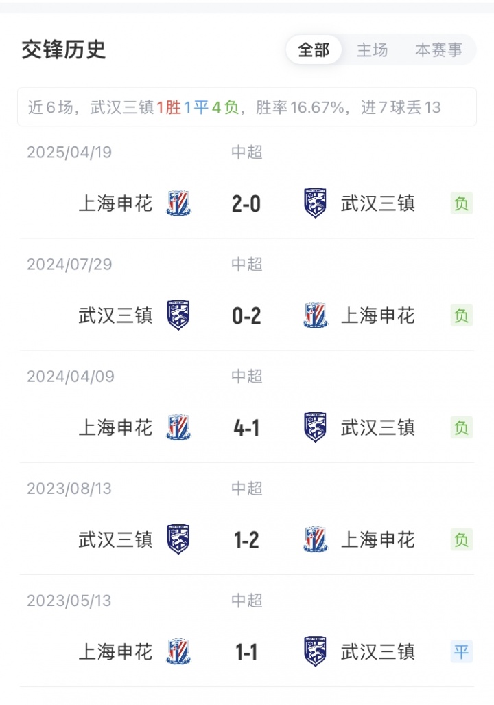 上海申花15胜4平3负积49分,排行中超第2;武汉三镇5胜6平11负积21分,排行中超第12。
