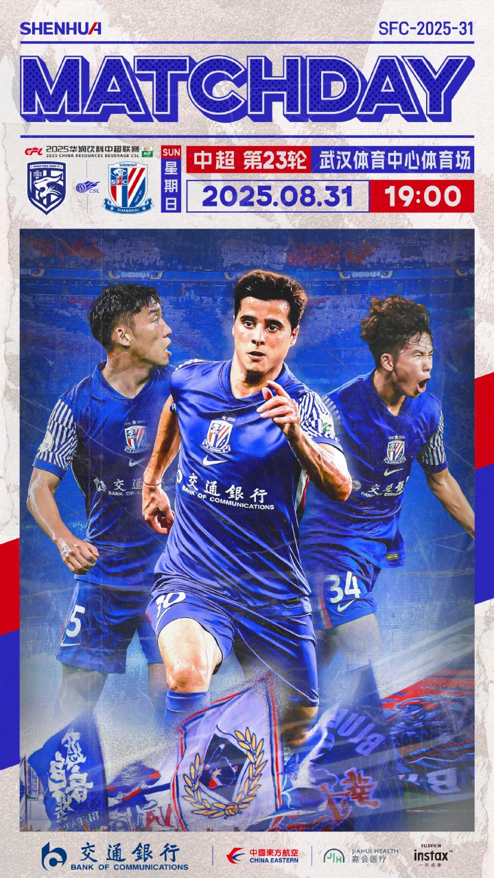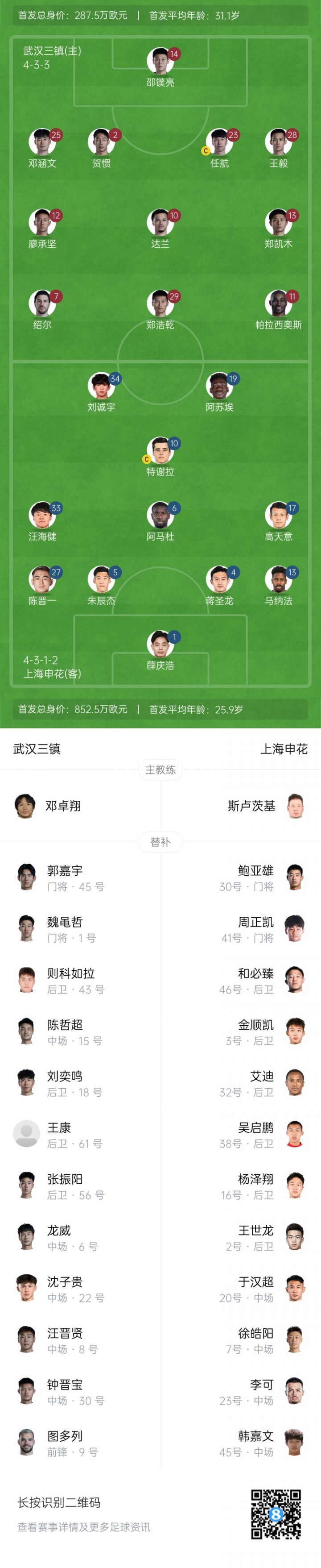 08月31日讯 北京时间19点,中超第23轮,武汉三镇主场迎战上海申花,赛前两边公布首发。