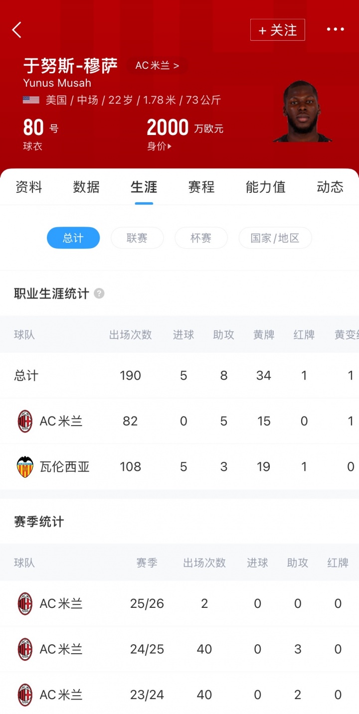 穆萨现年22岁,司职中场,加盟米兰后球员贪图出场82次,孝敬5助。现在穆萨德回身价为2000万欧元。