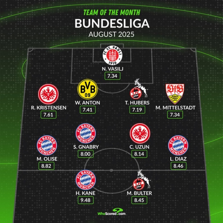 whoscored列德甲8月最好阵:凯恩领衔拜仁前场4东谈主组,安东在列