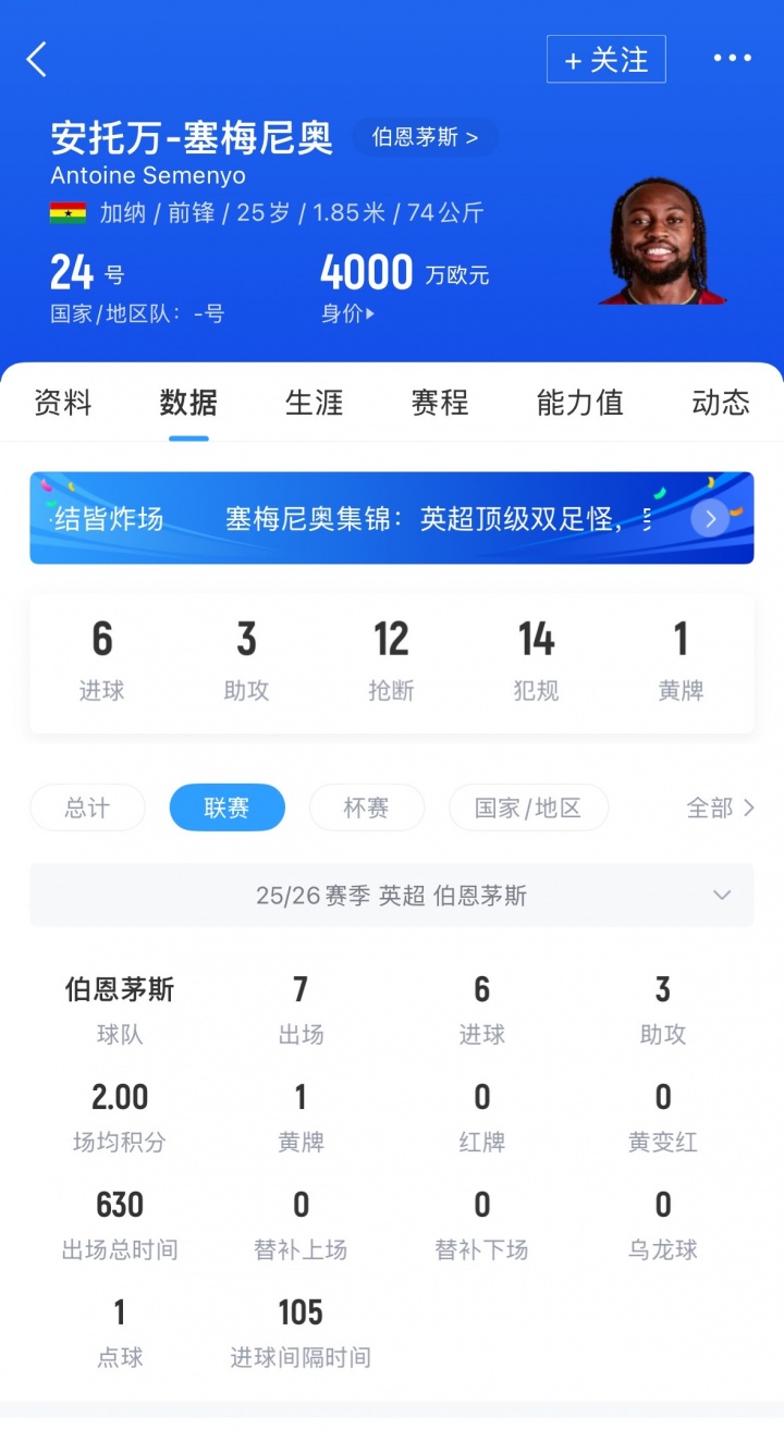 而伯恩茅斯方面以为,现年25岁的塞梅尼奥如今至少值7500万镑,本赛季于今,他照旧斩获6个联赛进球,并孝顺3次助攻。
