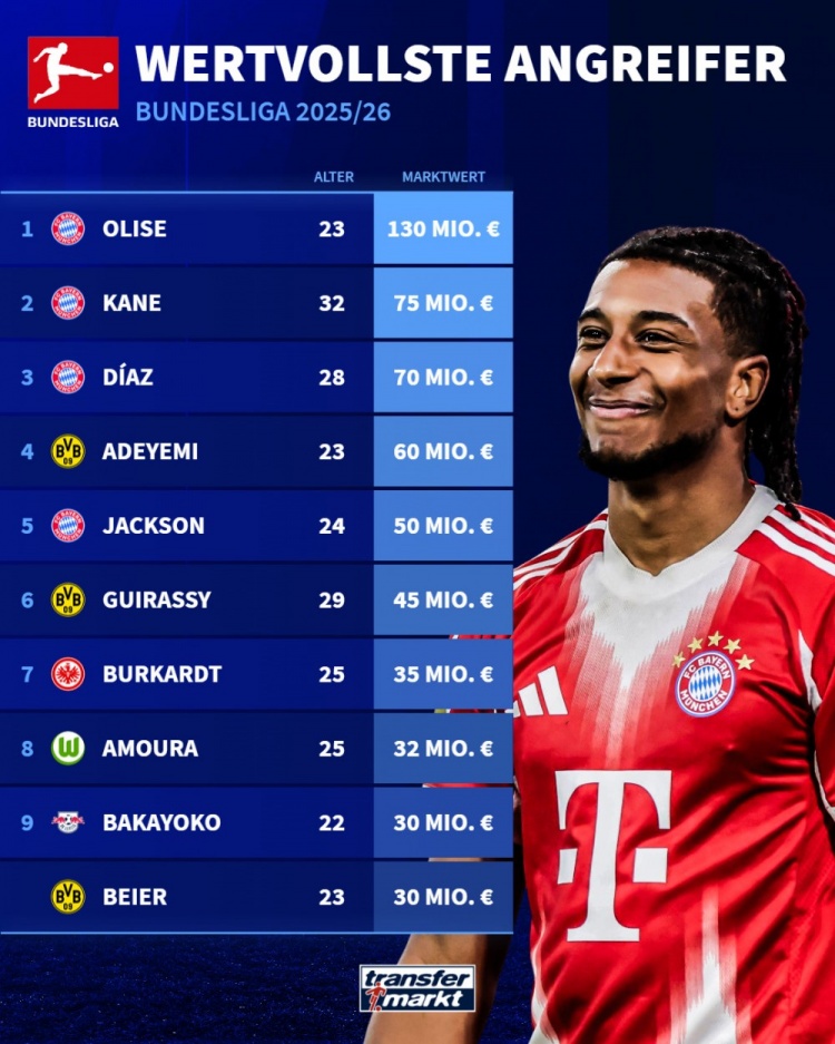 以下为德甲远程球员身价top10: