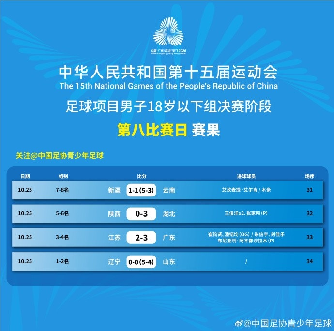 全运会U18男足名次:辽宁队夺得金牌 山东队获银牌 广东队获铜牌
