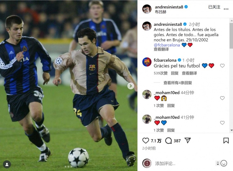 伊涅斯塔社媒晒出首秀的相片,配文:“在奖杯、进球乃至一切之前,故事始于布鲁日的阿谁夜晚,2002年10月29日。”