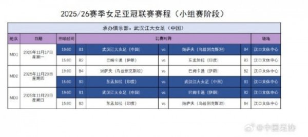 武汉女足亚冠小组赛赛程笃定,比赛11月17日-23日在武汉进行