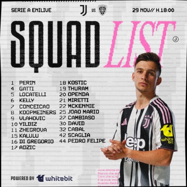 尤文对阵卡利亚里大名单:弗拉霍维奇、伊尔迪兹在列,加蒂转头