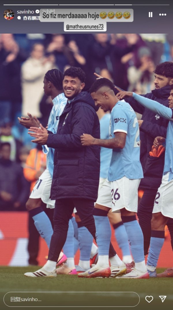 9月15日讯 英超第4轮比赛,曼城主场3-0打败曼联。 此役萨维尼奥为曼城替补出场,但他对我方在场上的施展似乎并不现象。 萨维尼奥赛后在搪塞媒体晒出与努内斯的合照,自黑配文:“我今天踢得像屎相同烂!”......查看更多