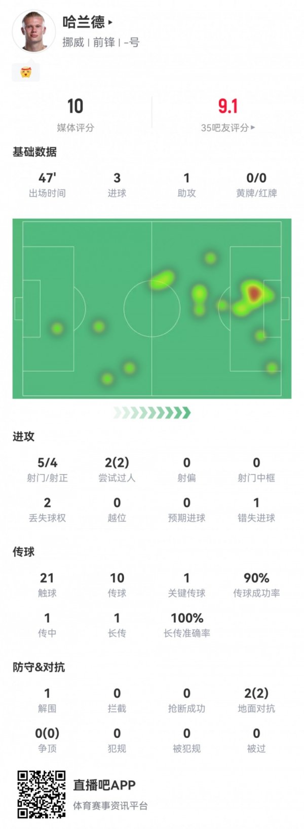 半场戴帽!哈兰德半场:3球1助5射4正1次错失进球,获评满分10分