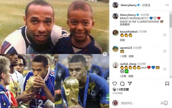 亨利社媒晒与姆巴佩畴昔合照:干得好小伙子,克莱枫丹制造