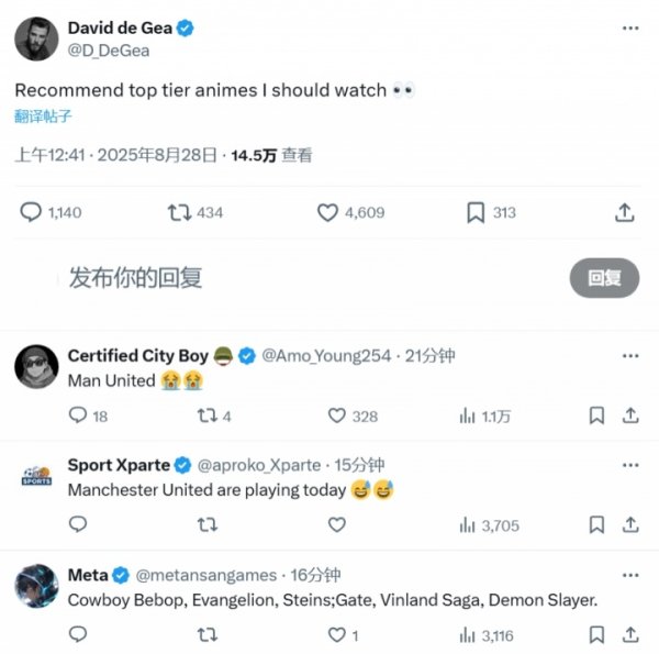 难绷😅德赫亚发文求保举好动漫,球迷恢复:今晚有曼联比赛