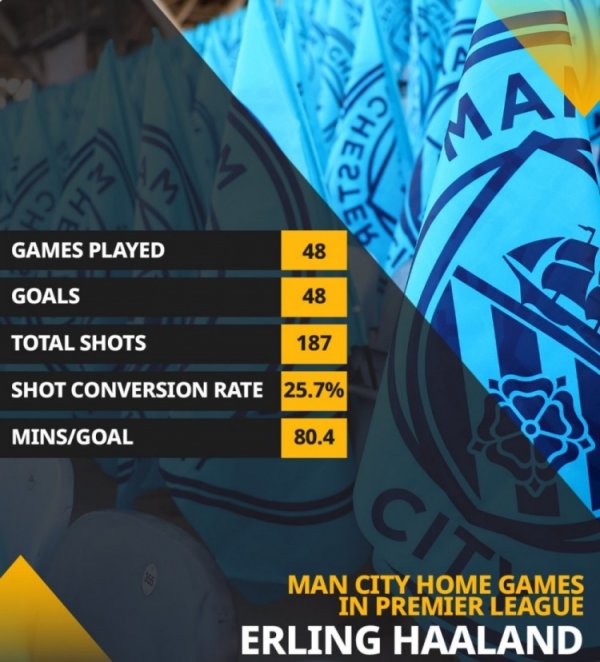 哈兰德48场英超主场比赛进48球,独一50场内进50球的是希勒