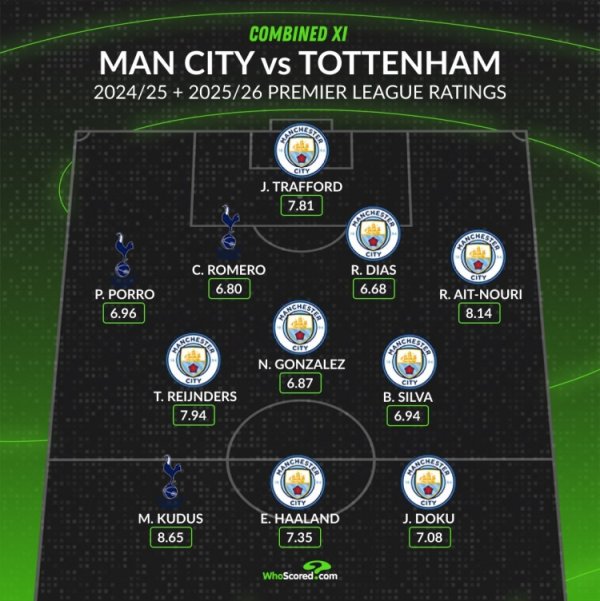 WhoScored曼城+热刺声势:哈兰德、库杜斯在列,热刺仅3东说念主