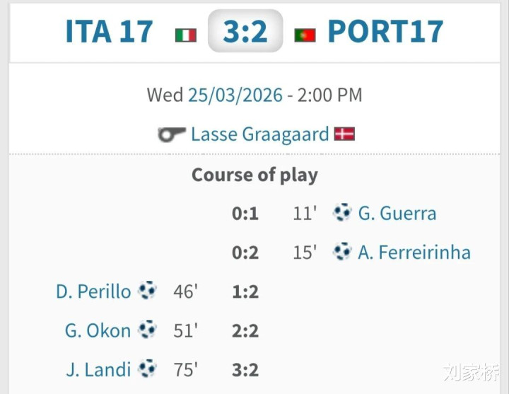 3月25日晚,U17欧洲杯预选赛A2组结束一场重要赛事 ,意大利U17队3-2力克葡萄牙U17,赢得小组赛开门红。