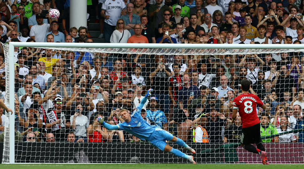 上半场进行到第37分钟时,主裁判一刹叫停比赛,回看VAR后认定富勒姆球员禁区内抱摔芒特,漂浮给了曼联一粒点球,B费准备主罚点球时,失慎和裁判撞了一下,这件小事让B费径直摊手向主裁判抒发不悦,热沈也影响了他的证实,主罚的点球不着边缘,径直飞出了底线,错失随心僵局的绝佳契机。