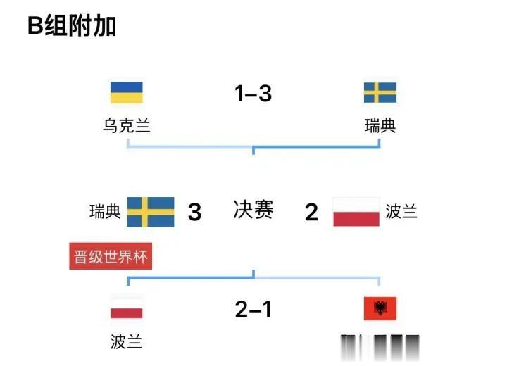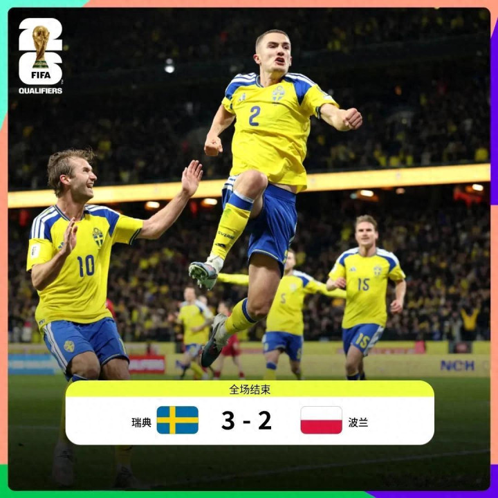 附加赛准总决赛 ,3-1干净利落拿下乌克兰。总决赛 对阵拥有莱万多夫斯基的波兰,瑞典两度领跑 两度被扳平,第88分钟,约克雷斯门前补射完成致胜球 ,3-2,瑞典昂首晋级下一轮 。