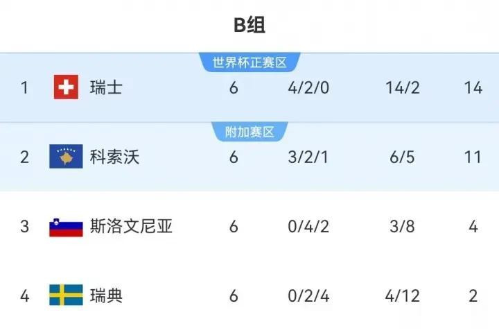 先看看瑞典队的小组赛表现:6战2平4负,进4球失12球,面对瑞士、科索沃和斯洛文尼亚,这支北欧劲旅竟然一场未胜,稳稳坐在小组垫底的位置。