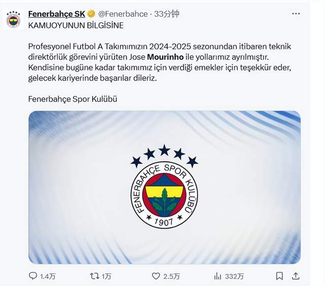 何塞-穆里尼奥与咱们分说念扬镳,关于穆里尼奥的付出和职责,咱们抒发感谢,道喜他将来一切告成。