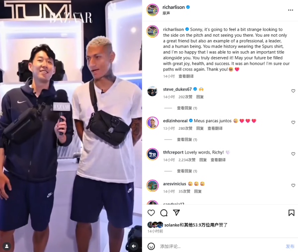 雷速体育8月4日讯 孙兴慜行将离开热刺,加盟好意思职联的洛杉矶FC。热刺时尚里沙利松更新社媒,发布告别了老队友孙兴慜。 里沙利松:Sonny,在球场上往傍边一看却见不到你,那种嗅觉一定会有些奇怪。你不仅是我的老友,更是行状球员、首长和作念东说念主的典范。你穿戴热刺球衣书写了历史,而我也无比红运能与你并肩取得那座有趣超卓的冠军奖杯——这份荣誉你当之无愧!愿你将来的每一天王人充满粗鲁、健康与到手。与你并肩是我的侥幸,我肯定咱们终会重逢。谢谢你!”......查看更多