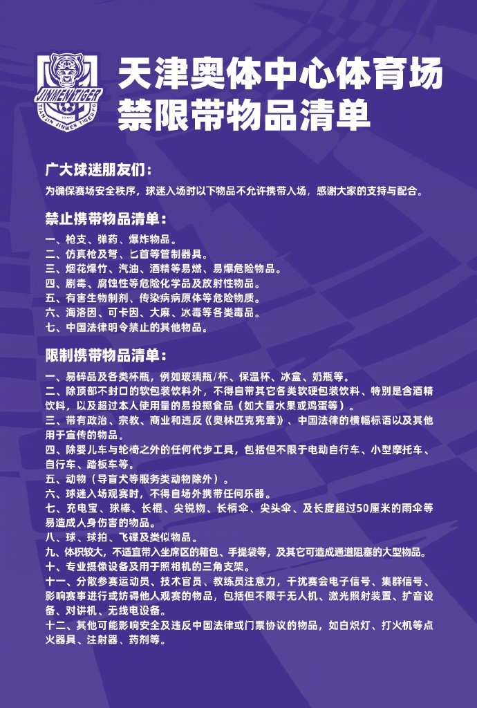 亲爱的球迷一又友们:为确保赛场安全治安,球迷入场时以下物品不允许佩戴入场,感谢人人的救助与合营。