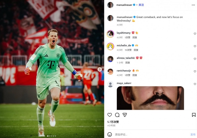 欧冠将战阿森纳!诺伊尔社媒:伟大的逆转!目下专注于周三的比赛