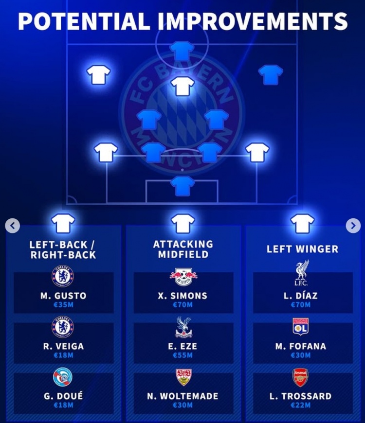 德转列拜仁待补强位置:左边锋&边后卫&前腰 迪亚斯&西蒙斯在列