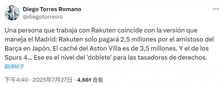 Diego Torres Romano社媒写说念:“又名与乐天配合的东说念主士阐明了皇马方面的说法,乐天仅为巴萨在日本的友谊赛支付250万欧元。阿斯顿维拉(季前赛)的出场费为350万欧元,而热刺则为400万欧元。”